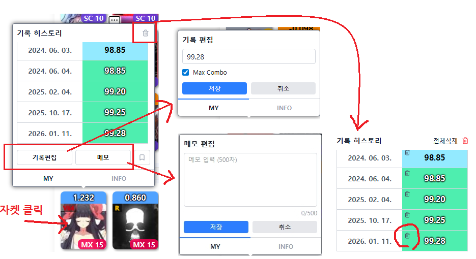 - 자켓을 클릭하면 자켓레이어가 나오고 "기록편집"/"메모"/"기록삭제" 등을 할 수 있습니다.
