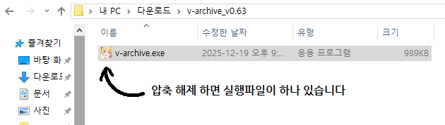 1. 클라이언트 압축파일(v-archive_vX.X.zip)을 다운로드 받아서 압축을 해제합니다.