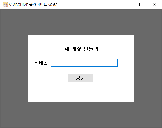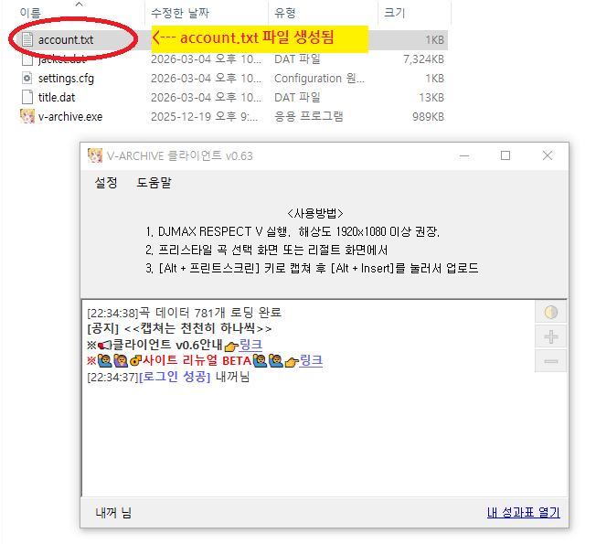 - 계정을 생성하면 클라이언트 폴더에 account.txt 파일이 생성됩니다. account.txt 파일 안에는 자동으로 생성된 비밀번호가 들어있어서, 반드시 이 파일이 있어야 로그인이 되기 때문에 신경써서 보존해주셔야 합니다. 비밀번호 없이 V-ARCHIVE를 이용할 수 있게 하려다보니 이런 형태가 되었습니다. 양해바랍니다. 만약에 분실했다면, 웹에 로그인이 되어있다면 "마이페이지"에서 다시 다운받을 수 있습니다.