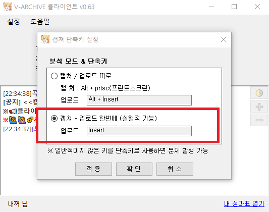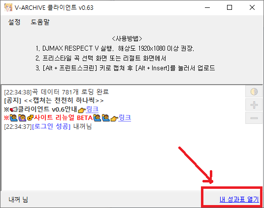 1. V-ARCHIVE 클라이언트와 DJMAX RESPECT V를 실행합니다.