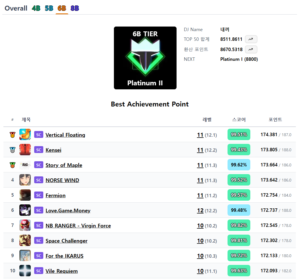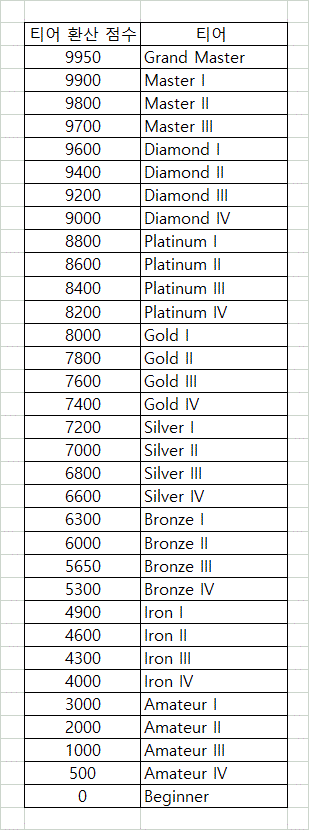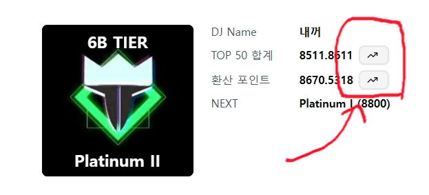 - 환산 포인트 = TOP 50 합계 점수를 만점을 10000점으로 놓고 환산한 값. 이 환산 포인트를 기준으로 티어가 결정됩니다.