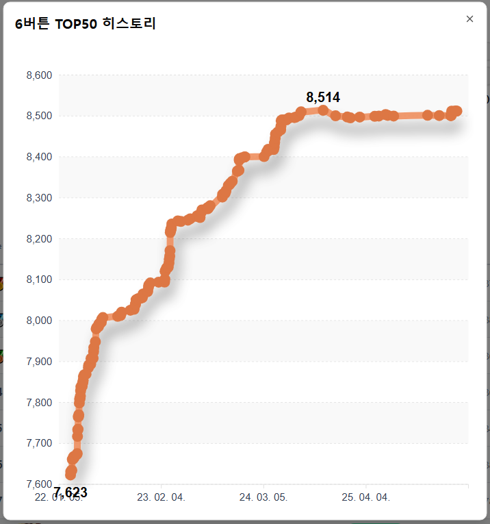 내 티어 페이지의 그래프 버튼을 클릭하면, 티어 히스토리를 그래프로 볼 수 있습니다. 각 버튼에 50개 이상의 곡을 기록해야 히스토리가 남습니다.